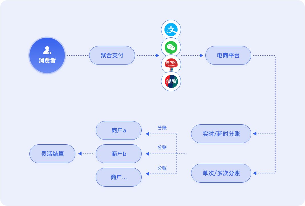 携手合作伙伴,为客户提供全场景收款、合规清算、多方分账、资金托管等全套解决方案