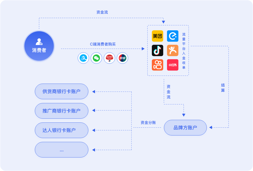 各渠道收款先流入持牌支付机构备付金账户,向多方合规清分后,仅剩利润落入您的实际账户
