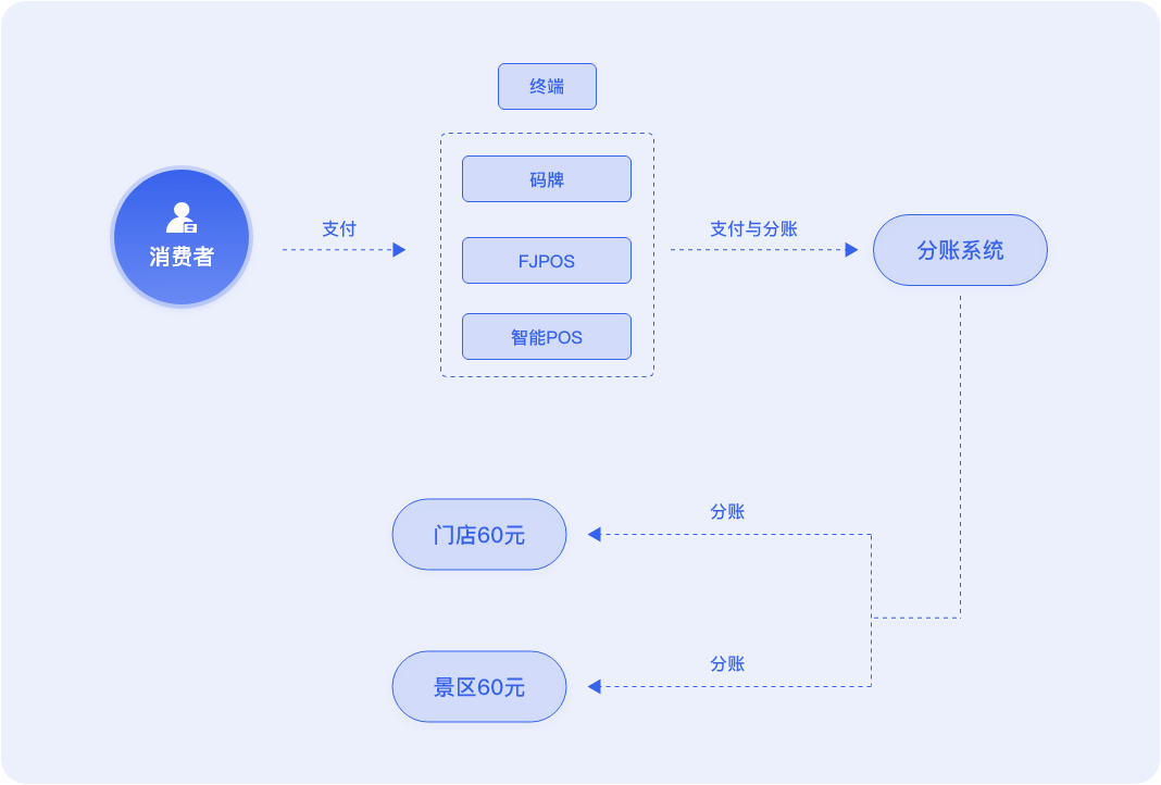 快捷接入全场景支付方式,系统自动对每笔订单进行记账对账和多方分账。收款先入银行 监管备付金账户,再由持牌金融机 构向各方分账后,剩下利润落入平台对公户,只需按实 际所得缴税,且规避二清风险。